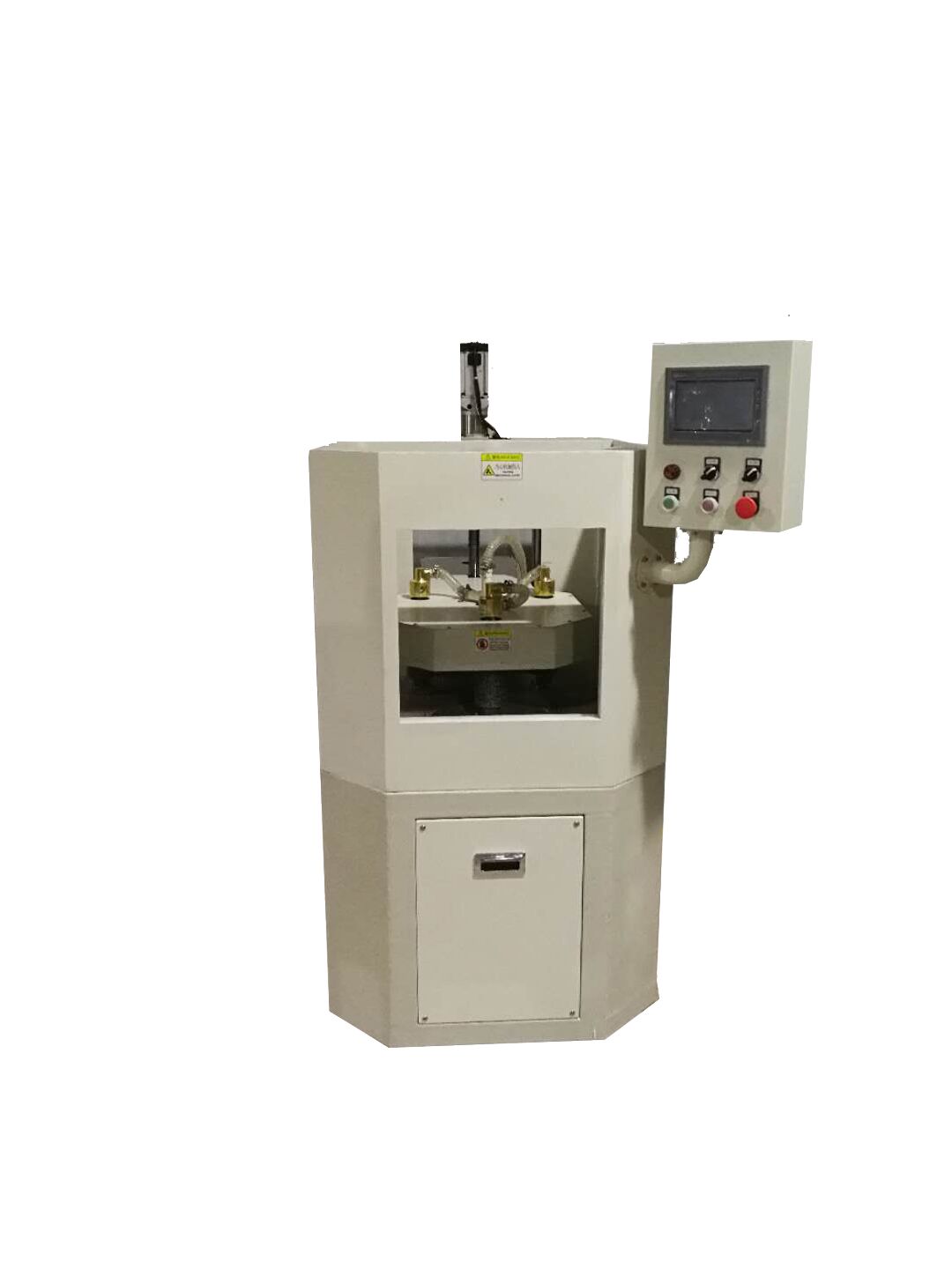 工作過程:經過防水處理的手機放在下盤,通過固定大小的卡槽固定。設定好參數後啟動,上下盤以相反的方向轉動,並且上盤向下運動,機器進入計時狀態,達到設定正轉時間後,上盤上升一段距離,然後上下盤反向轉動,進入反轉時間,打磨樣品,反轉時間結束後,一輪打磨過程結束。